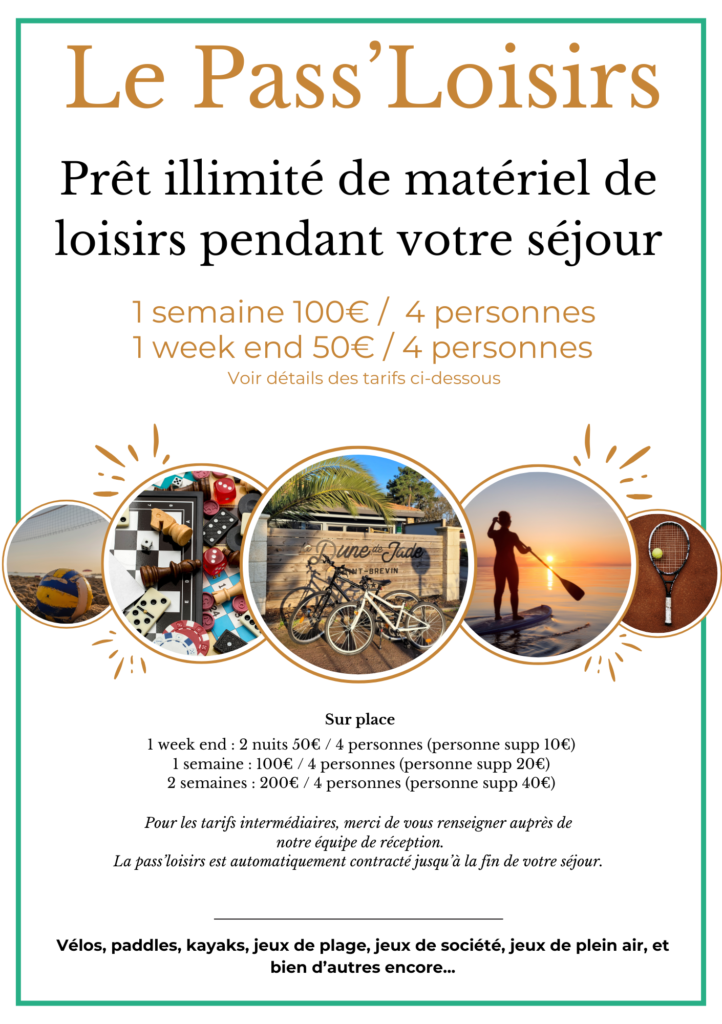 Avec le Pass’Loisirs, vous pouvez emprunter des vélos, des kayaks, des paddleboards, des équipements sportifs, des jeux de société, des jeux de plage, des équipements de loisirs… bref, de quoi vous amuser sans limite pendant votre séjour.