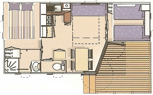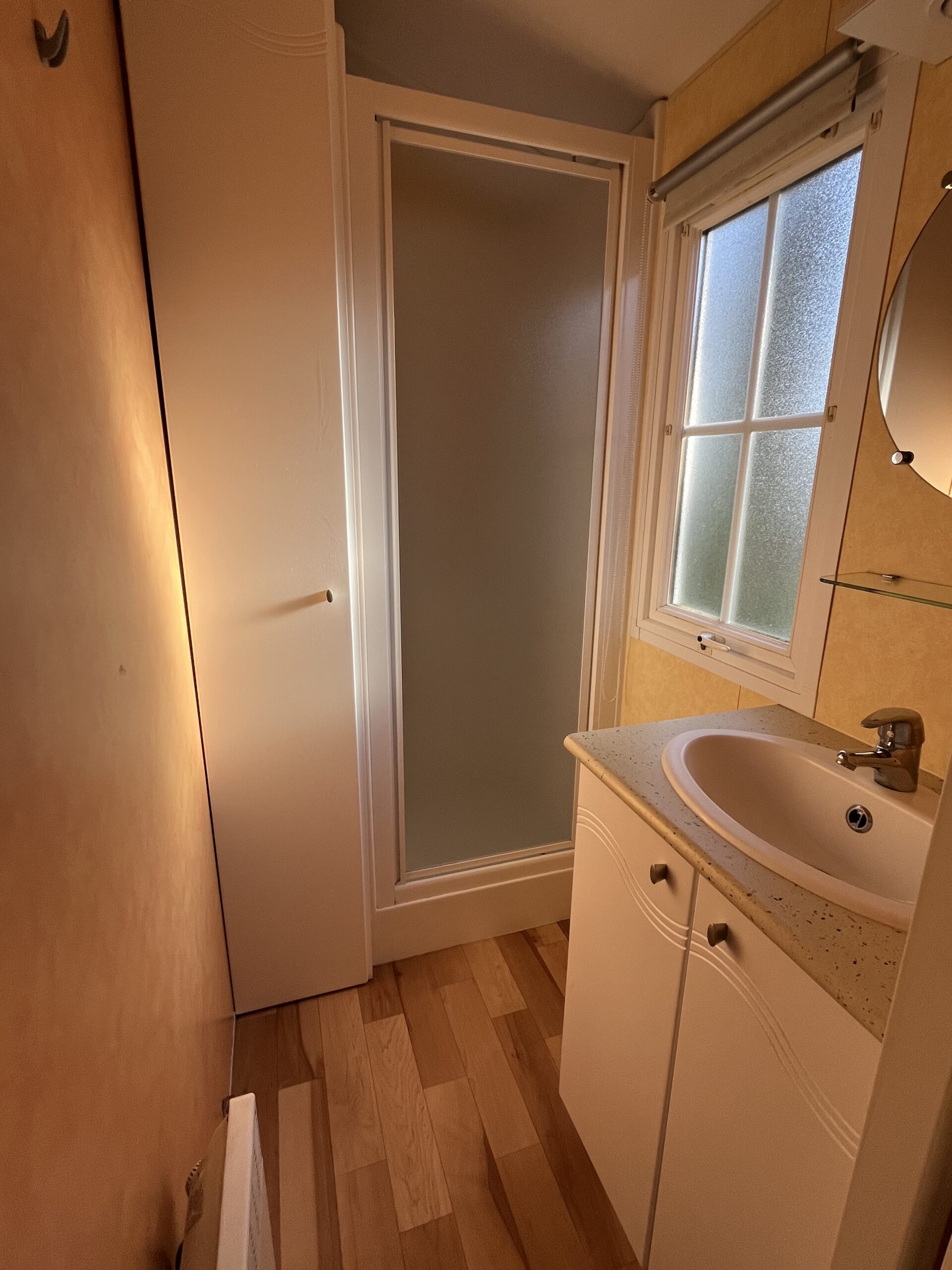 / ! \ Mobil home ayant subi un dégât des eaux : meuble de cuisine partiellement gonflé, meuble de salle de bain gonflé, sol partiellement touché sous un meuble de cuisine. Ce dégât a été traité à temps, permettant de ne pas s’étendre, les éléments ont été touchés mais restent fonctionnels et n’ont pas pourris / ! \